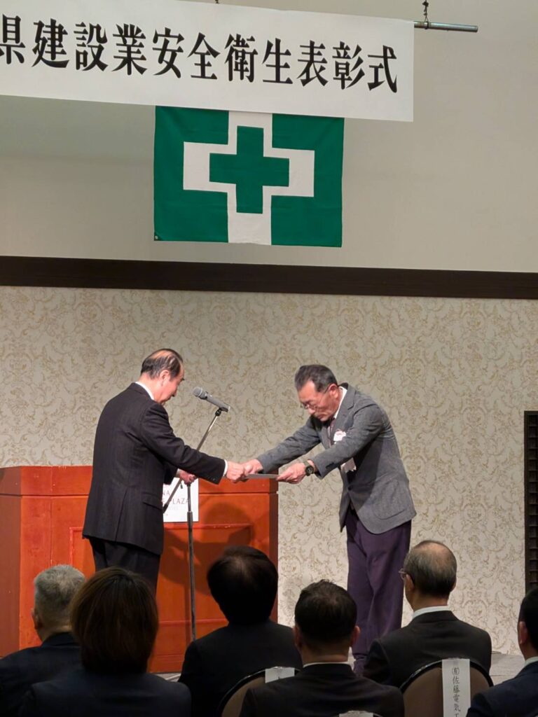 永年にわたり、現場代理人並びに主任・監理技術者として「安全第一」を心掛け、無事故・無災害の現場づくりに尽力してきた功績が認められたものです。